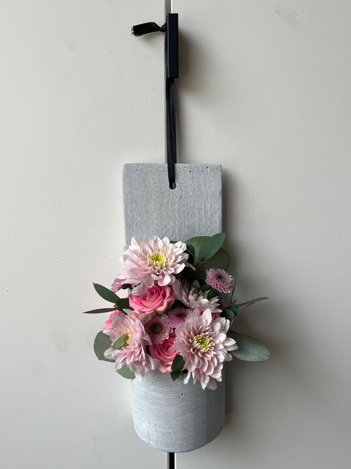 Mini-betonvormpje om te hangen aan een columbarium met roze bloemwerk.