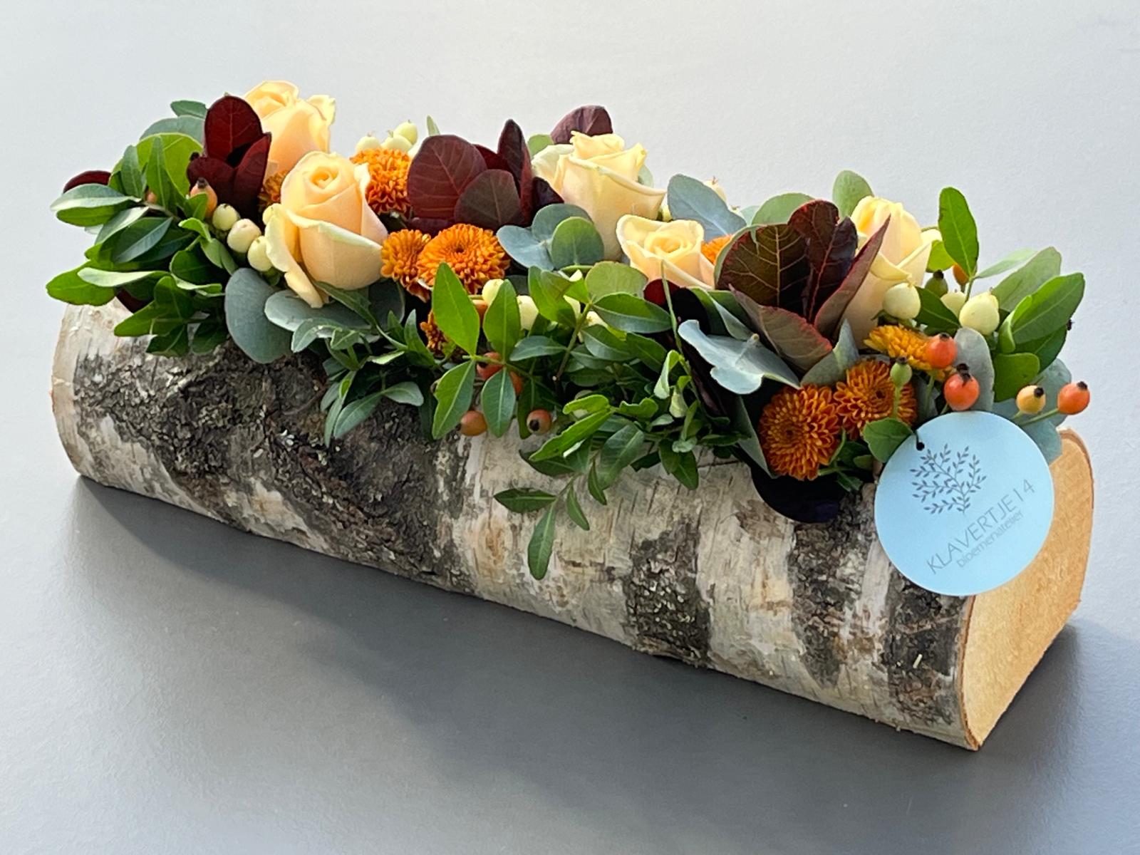 Boomstam gevuld met een herfststukje in zachtoranje, oranje, bordeaux en groene bloemen.