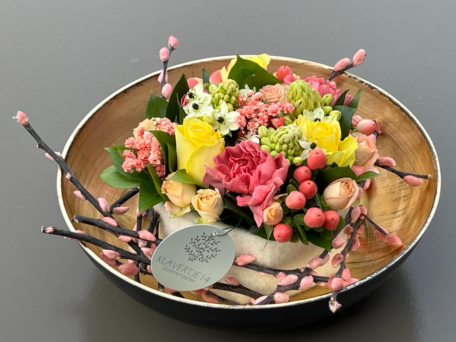 Een fris lentestuk met gekleurde wilgekatjes gepresenteerd in een gouden schaal (buitenkant zwart) in kunststof.