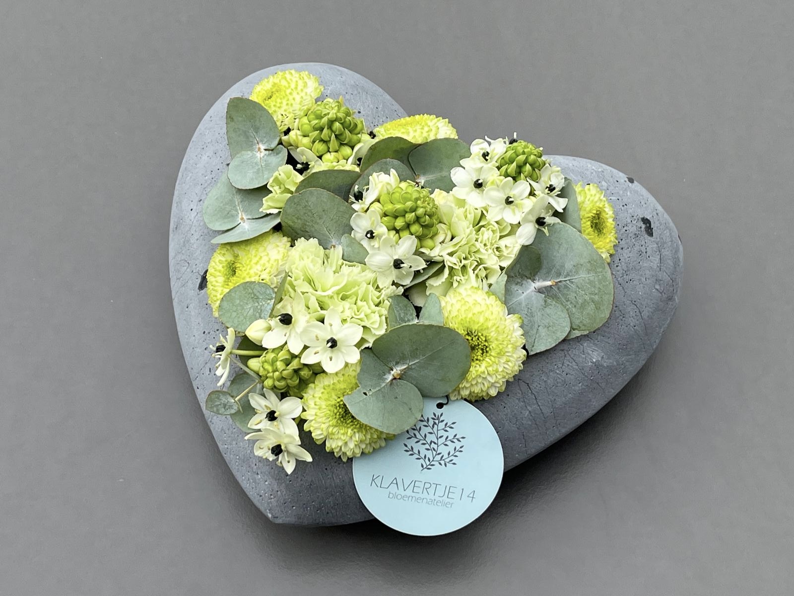 Hart in betonvorm gevuld met chrysant, arabicum, eucalyptus en anjers in wit-groene tinten.