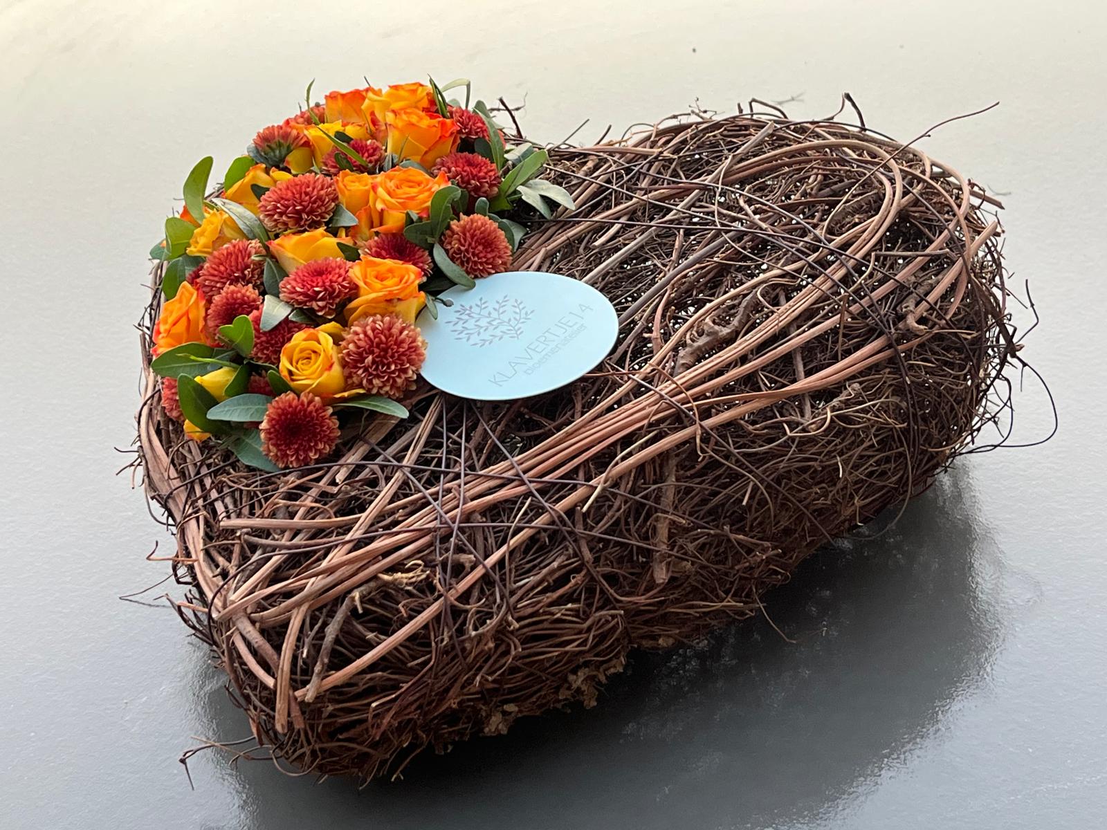 Prachtig bloemstuk in rieten hartvorm met verfijnd bloemenwerk met chrysantjes en trosrozen.