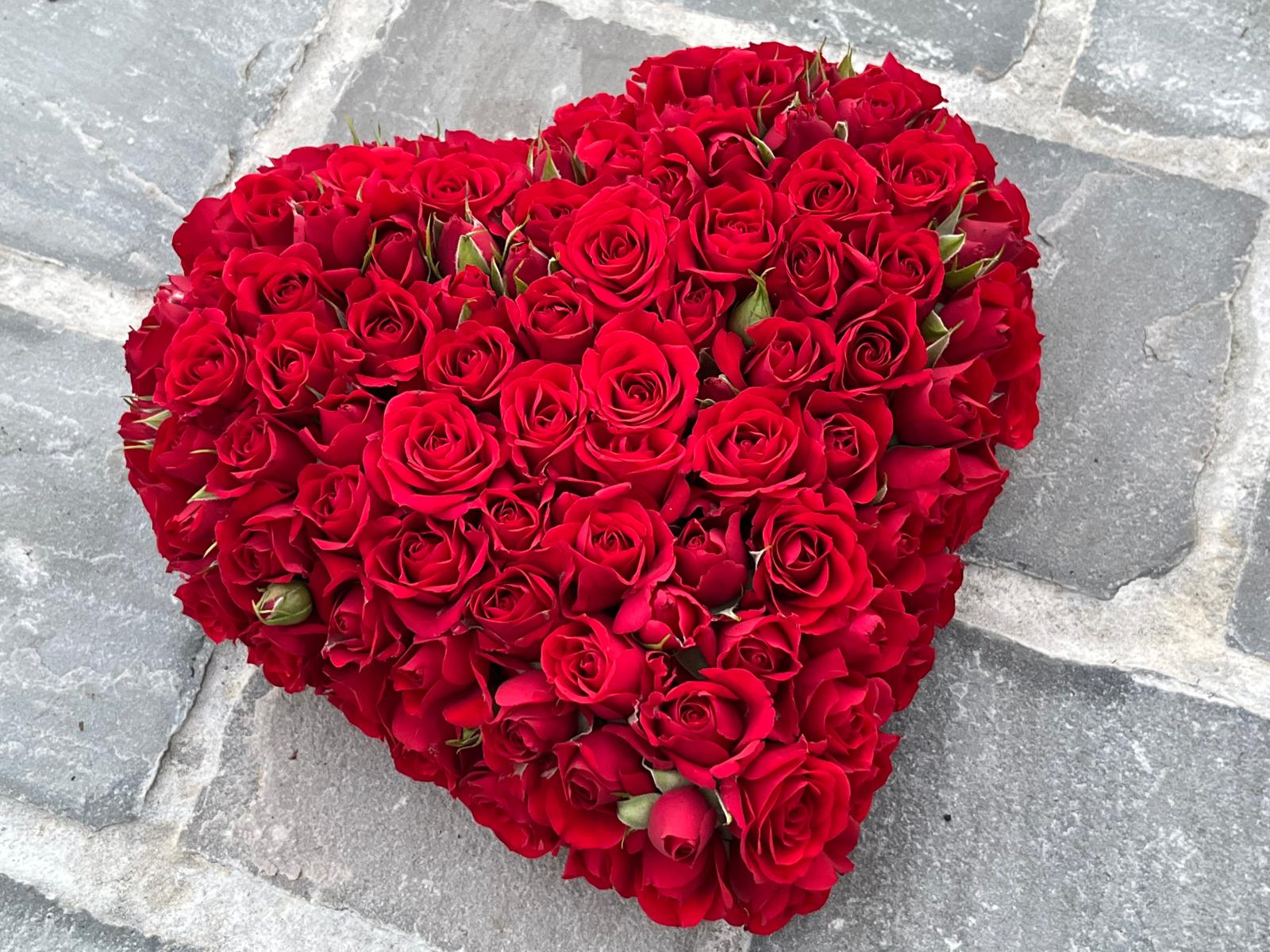 Bloemstuk in hartvorm op steekschuim met rode trosrozen.