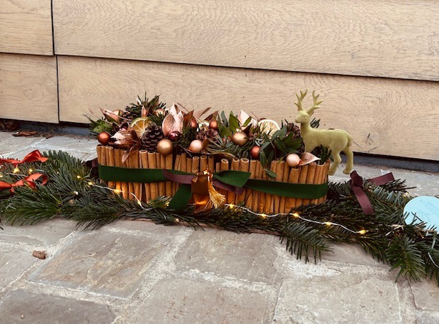 Een heerlijk geurend langwerpig Kerststuk (ongeveer 80 cm) bestaande uit een bloemstuk (ongeveer 38 cm) met kaneel, kerstgroen en kerstdecoratie gepresenteerd op een kerstgroen-bodem.