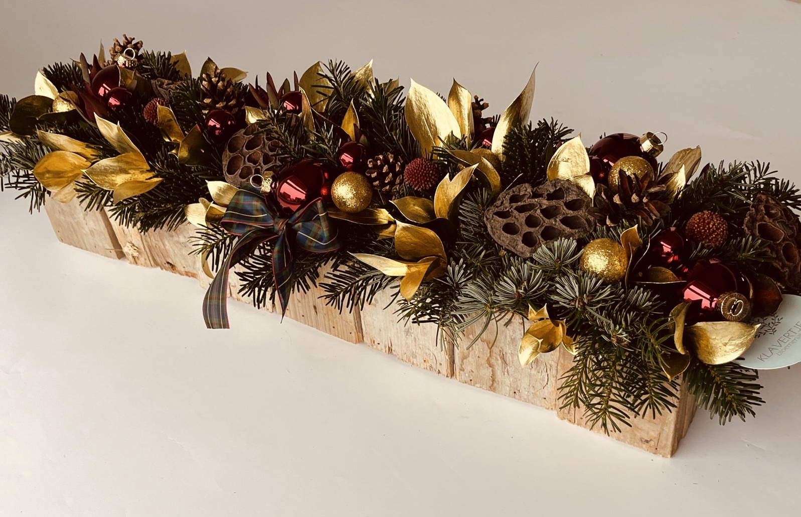 Een langwerpig kersttafelstuk met hout in tinten van rood en goud met onder meer kerstgroen en gedroogde natuurlijke materialen en kerstdecoratie.