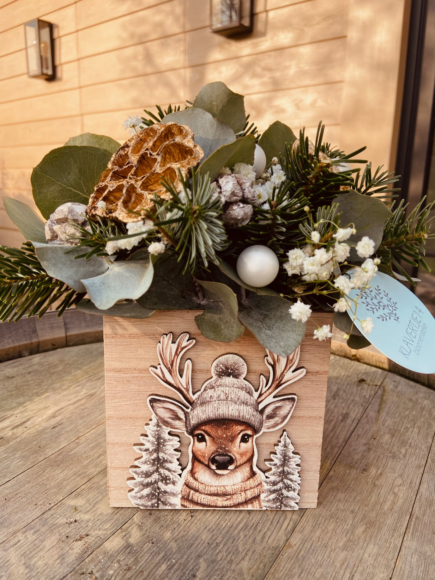 Een leuk modern kerststukje in tinten van groen, wit, goud.