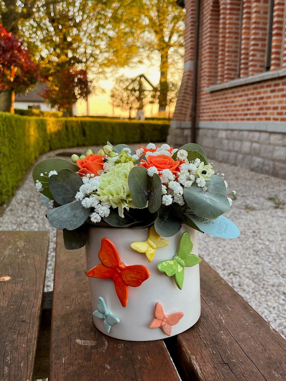 Een exclusieve design-bloempot met keramiekvlinders op bevestigd afgewerkt met verfijnd bloemenwerk in oranje, groen en wit.