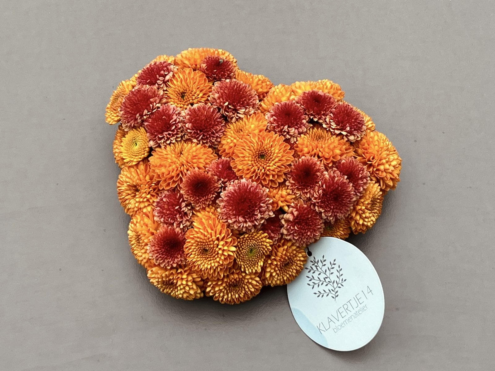 Mini-hart (oasisvorm) met chrysantjes tinten van oranje-roest-bordeaux.