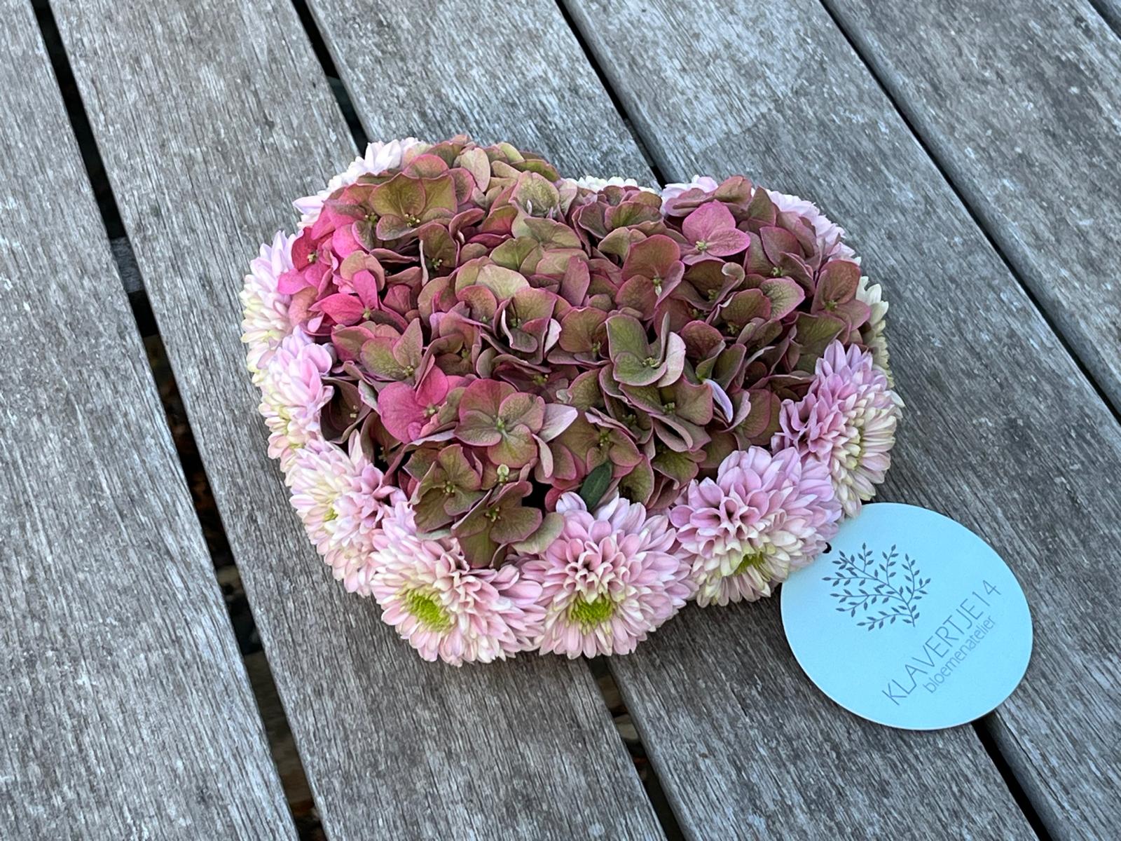 Mini-hart (oasisvorm) met chrysantjes en hortensia.