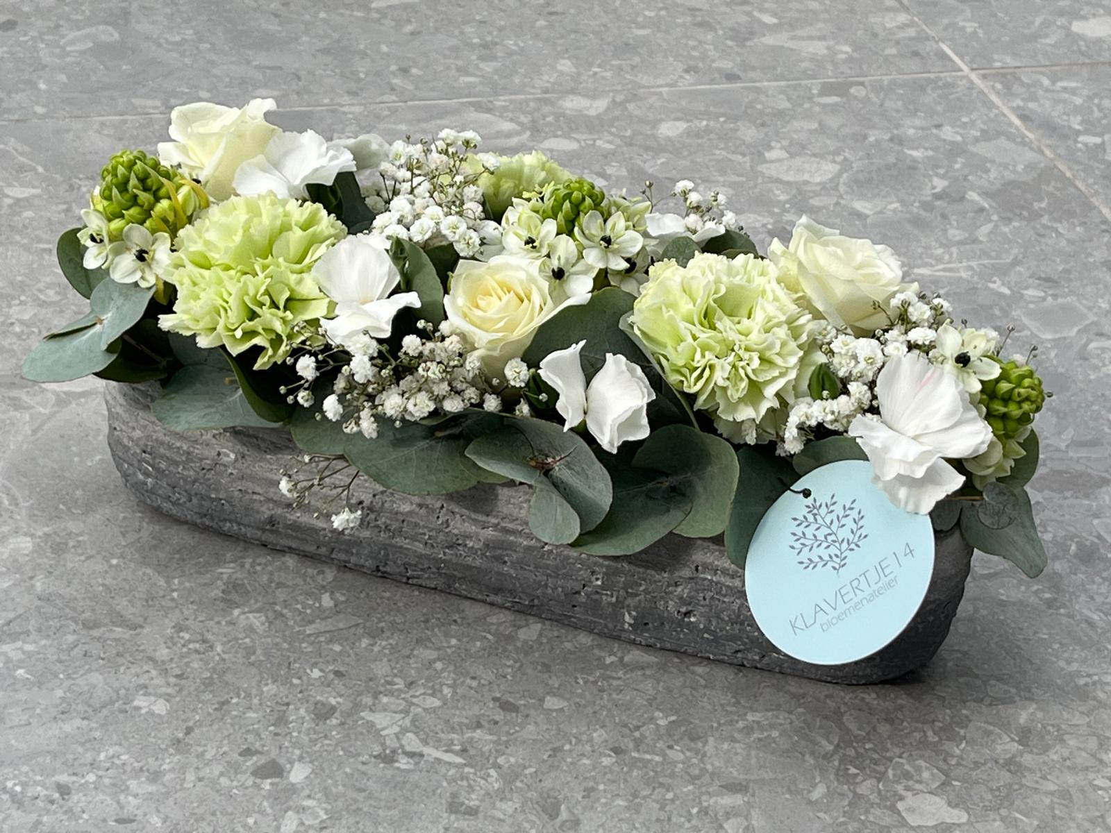 Langwerpig / ovaal bloemstuk in betonnen bloempotje in wit-groene tinten.