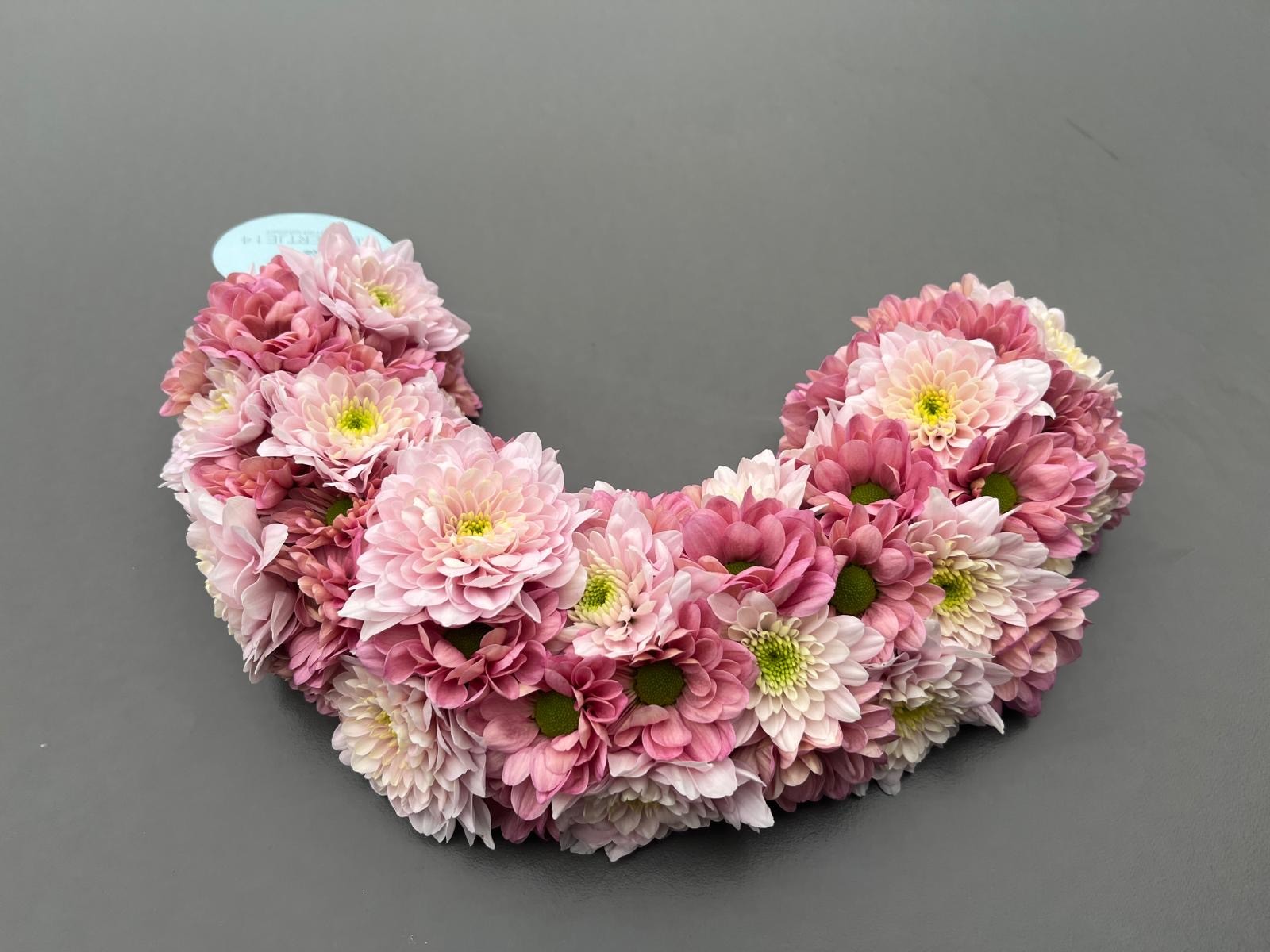 Boogvorm (kan op het graf neergelegd worden of kan opgehangen worden aan een columbarium) met 2 soorten roze chrysanten. 2 groottes mogelijk.