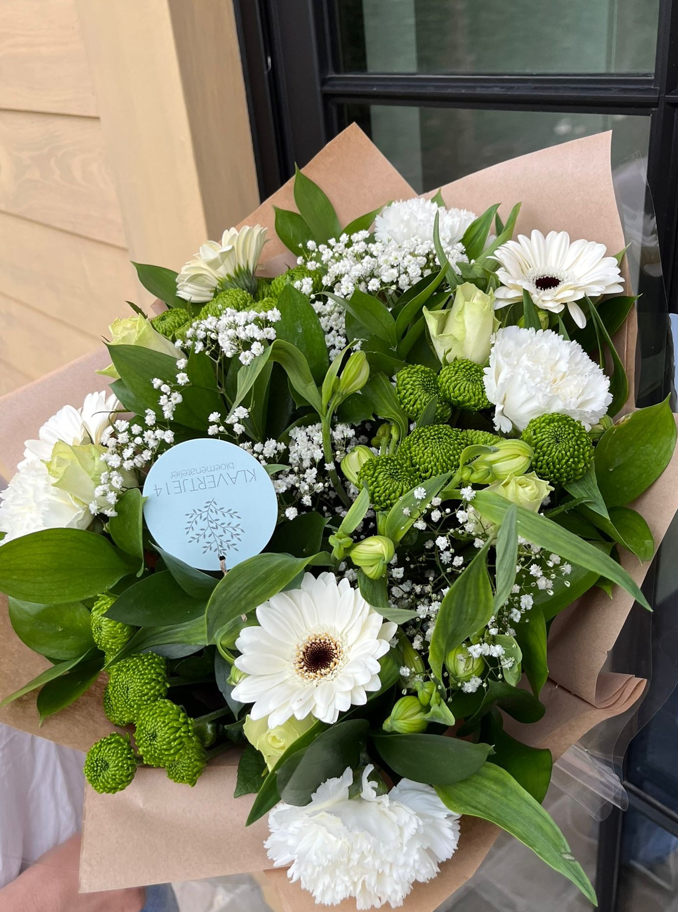 Klassiek, rijkelijk gevuld wit-groen boeket dat zal stralen in mama's interieur!